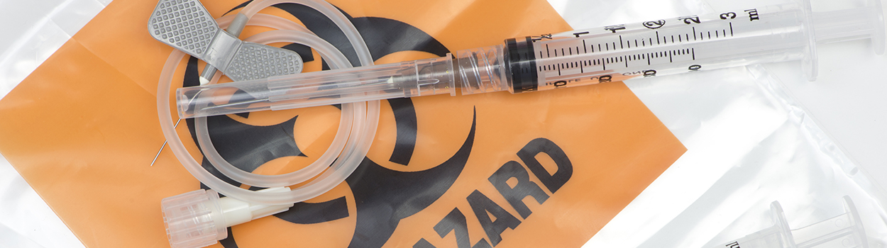 Today, the bio-hazardous containers and bags seen throughout hospitals medical clinics, veterinarian clinics, and doctors’ offices are used to safely remove sharps, needles, other medical materials which could contain any human or animal blood or bodily fluid. Medical/infectious waste also includes paper towels, wipes, gloves, syringes without sharps, bandages and/or wound dressings with any amount of blood or bodily fluid, dry or moist, as well as any other soiled or bloody material generated through medical care.